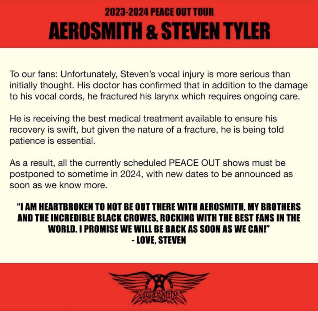 Aerosmith pospone su gira de despedida “Peace Out” después de que los médicos descubrieron que el daño en las cuerdas vocales de Steven Tyler era más grave de lo que originalmente se pensaba.