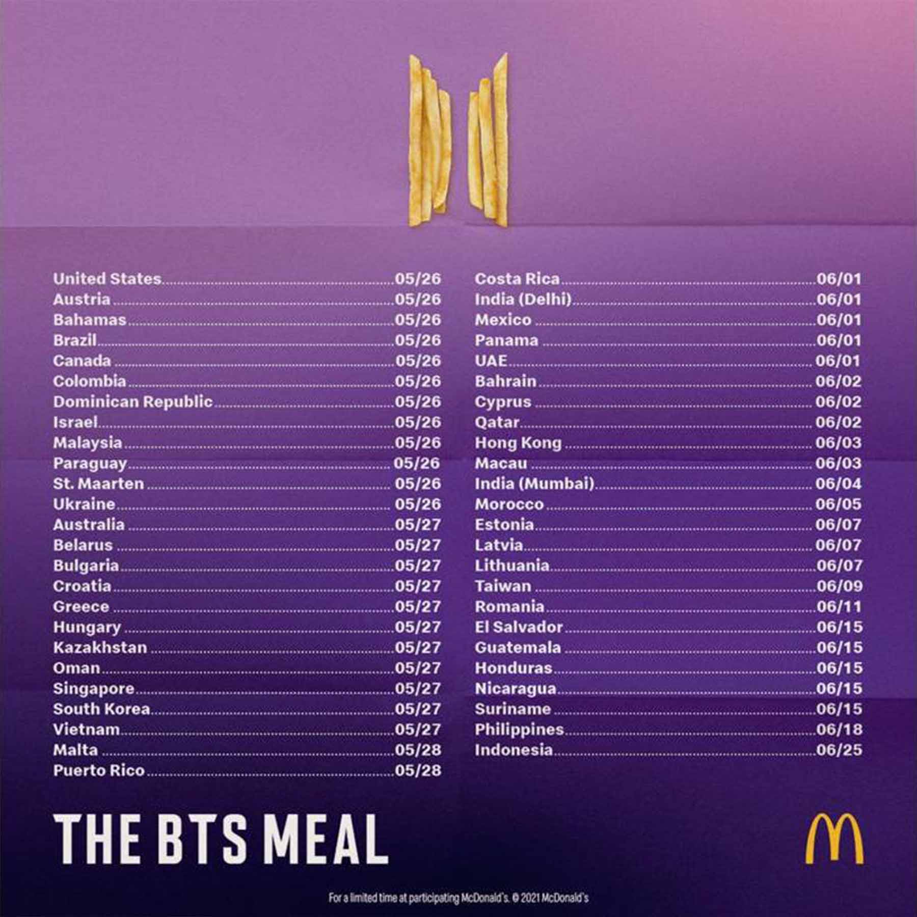 La “BTS Meal” estará disponible en 49 países incluyendo a Costa Rica. Para el caso de nuestro país será a partir del 1 de junio.