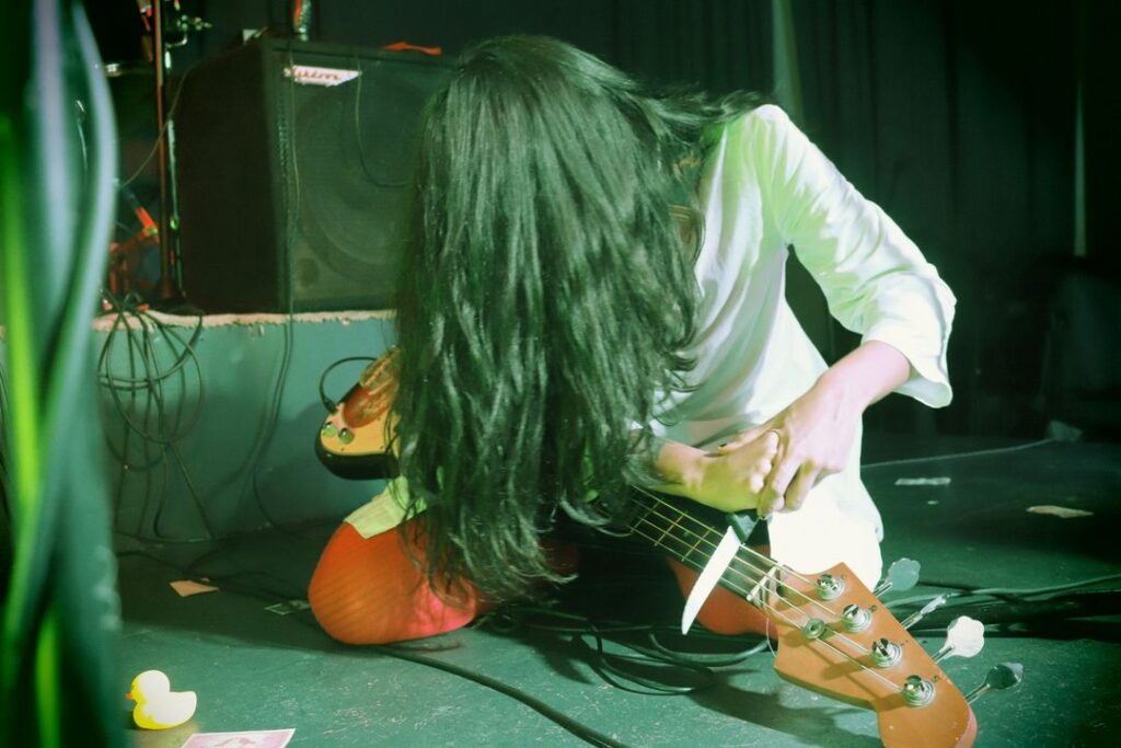 “Virgen de Cloro”: Después de una apertura enérgica, la banda apuesta por mantenernos con atención y nos presenta en la voz principal a Laura Ester. Los contrastes llegan. Laura parece una encarnación espiritual rabiosa pero zen de Kim Gordon y Kathleen Hanna que genera un complemento perfecto a la voz de Fabián. Esto sin duda llena de vitalidad y frescura el ambiente, es aquí cuando Emor empieza a demostrarnos que su paleta de colores es variada. Para reforzar este argumento, notamos también aquí la diversidad lírica: (Demasiada suavidad / Para siempre pavimentar / Toda la necesidad / Cuando no hace falta pensar… para besar el cloro). Las letras se vuelven más ¿enigmáticas? ¿Oscuras? Laura mencionó en el segundo concierto que esta canción la hizo pensando en la virgen. Diría que necesitamos explicaciones, pero quizás esta es la belleza de Emor: nos permite fantasear en sus letras, no pretenden atarnos siempre…hay libertad en este campo de juego.
