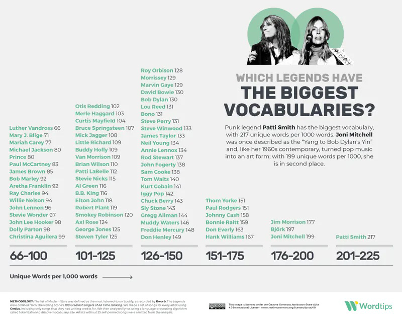 “WordTips” – la herramienta de búsqueda de palabras únicas- lleva tiempo analizando el lenguaje y vocabulario de distintos artistas, y su último estudio arrojó que quien mejor léxico tiene es Patti Smith con 217 palabras únicas por cada 1,000.