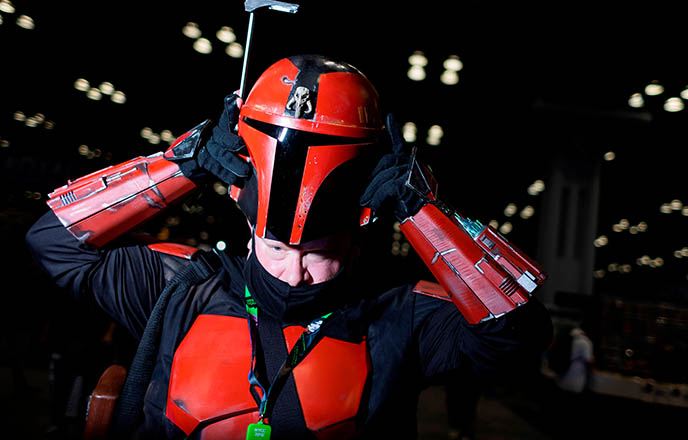 Entre los cientos de puestos que inundan las dos plantas que ocupa la feria, uno puede chocar con el de venta de réplica de cascos y algunas armas que regenta Jeremy Rowland, originario de Portland, Oregon, donde mantiene abierta su tienda.
