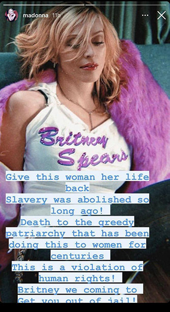 “Devuélvanle a esta mujer su vida. ¡La esclavitud fue abolida hace mucho tiempo! Muerte al patriarcado codicioso que ha estado haciendo esto a las mujeres durante siglos. ¡Esto es una violación de derechos humanos! ¡Britney te vamos a sacar de la cárcel!”, escribió Madonna.
